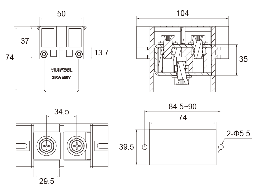 材质:PBT/合金铜,额定电流:350A,额定电压:600V DC Max.,线径尺寸:60mm²