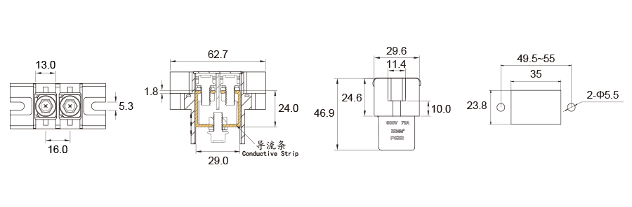 材质:PBT/合金铜,额定电流:75A,额定电压:600V DC Max.,线径尺寸:22mm²