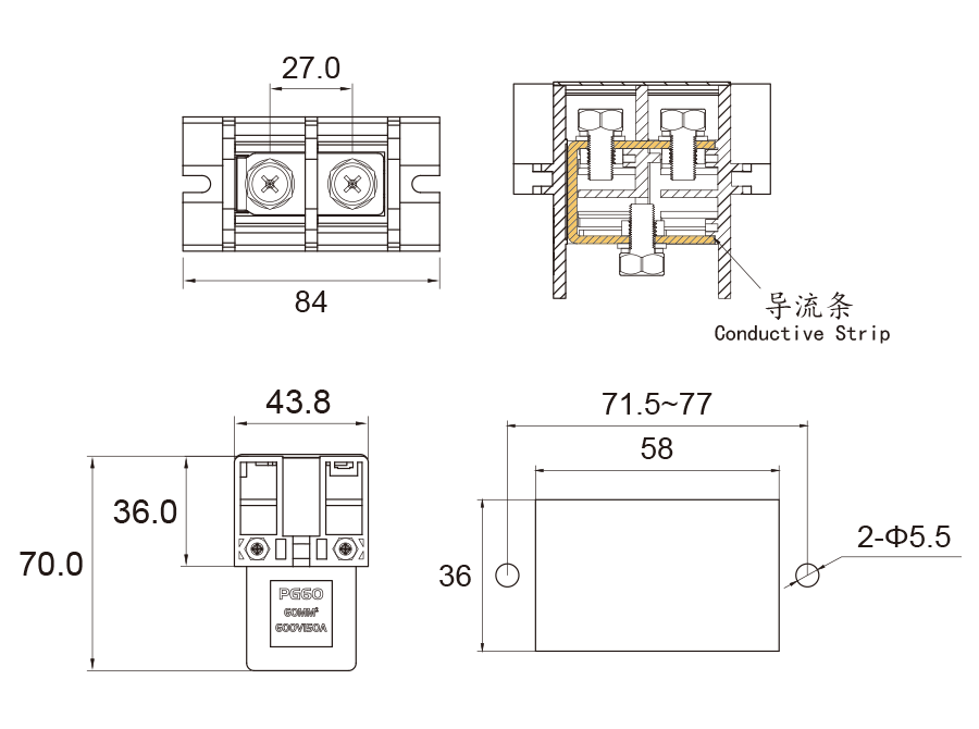 材质:PBT/合金铜,额定电流:150A,额定电压:600V DC Max.,线径尺寸:60mm²